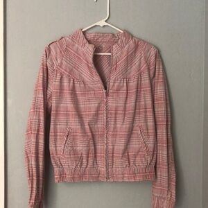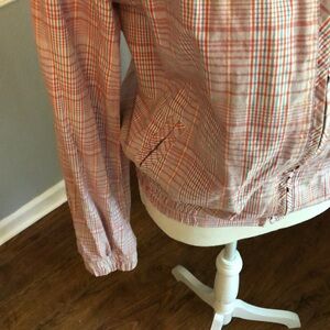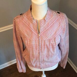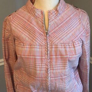 This little light cotton jacket is so cute on! Great light colors, well made with great stylish details. Simple and classic. Excellent condition. Tag says L but fits like a medium.