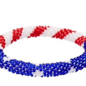 This glass beaded American Flag bracelet was handmade by a skilled artisan in Kathmandu Nepal. Sashka Co. bracelets roll over your hand and retract to the size of your wrist. Each bead color was chosen by the artisan, making each bracelet a special piece of artwork. Handmade using the world's finest glass beads. This beautiful bracelet was hand crocheted bead by bead in Nepal. Smoke free home. New never worn. This listing is for 1 (one) bracelet.