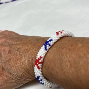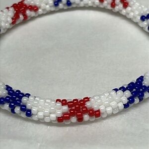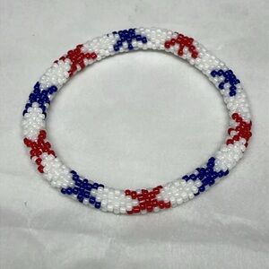 Stylish bracelet with red, white, and blue beads. Perfect for adding a pop of color.