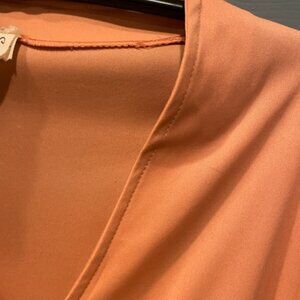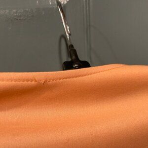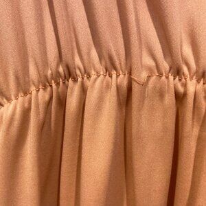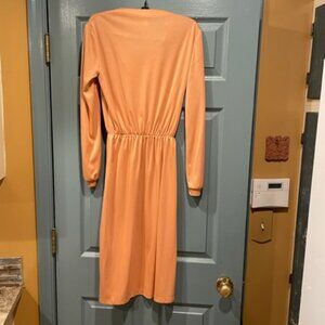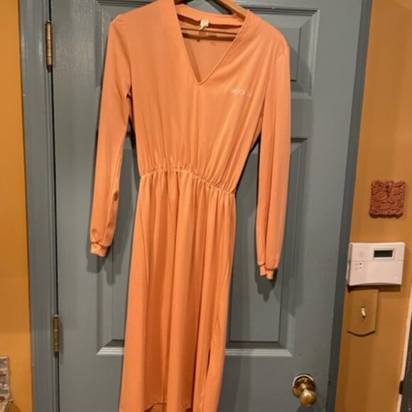 Peach/light coral colored long sleeved dress with elastic waist. Late 70s, has been in storage since then.