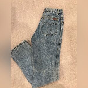 Stylish blue denim jeans by Gaston. Features classic stitching and button details. Vintage 80s