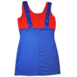 Sexy Miss Maryo costume includes sleeveless dress with oversized decorative buttons, attached top and sequin suspenders, all one piece. Sequin hat with adjustable snapback also included (Ships mostly flat, will need gentle reshaping upon arrival). Two piece costume set. Gloves, wig and hosiery sold separately, purchase together and save. Mustache not included. Blue and Red. 100% Polyester. Labeled as 1X/2X but RUNS SMALL