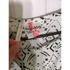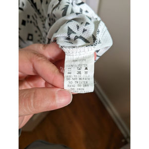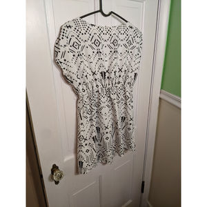 This black and white tunic has neat geometric designs in a black and white pattern. elastic waistband and loops to hold a belt included. Cap sleeves. Measurements are 17 inches pit to pit and 29 inches from shoulder to bottom.