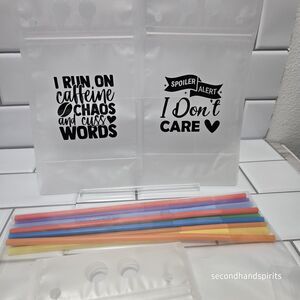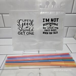 Ideal for picnics, parties, or daily use, these drink pouches can hold a variety of beverages, from juice to smoothies to iced tea. The included straws make it easy to sip your drink, while the clear design allows you to see what's inside. Whether you're looking for a fun and practical way to carry your drinks or a unique gift for someone special, these clear drink pouches with straws are sure to please. You get 10 pouches and 10 straws. These are decorated with Sassy Sayings that you see here. The last picture is just to show you how it works, this one will not be included in your sale. Yours will come as shown in first picture flat in a zippered bag.