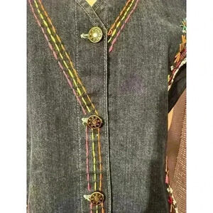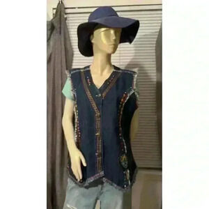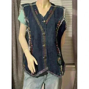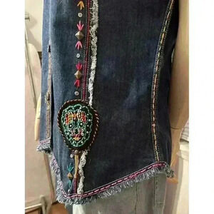 Add some flare to your wardrobe with the Sassy Sista Embroidered Studded Sparkle Day Of Dead Skull Denim Vest. Made from high-quality denim, this vest features a button closure and raw edge accents. The jewel and studded embellishments, along with the embroidered skull design, make for a unique addition to any casual outfit. Available in 2XL and in a trendy blue color, this vest is perfect for any season. The Sassy Sista's brand ensures quality and style for every fashion-forward woman. Closet