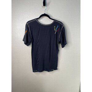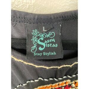 Sassy Sistas Embroidered Black T-Shirt Womens L Colorful Feather Scoop Neck
