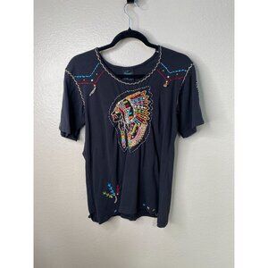 This Sassy Sistas T-shirt in size Large features an artistic embroidered Native-inspired feather design on a black fabric canvas. The lightweight cotton-spandex blend provides a soft, stretchy fit, ensuring all-day comfort. Decorative stitching along the neckline and hem adds unique character and charm.