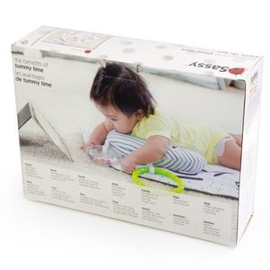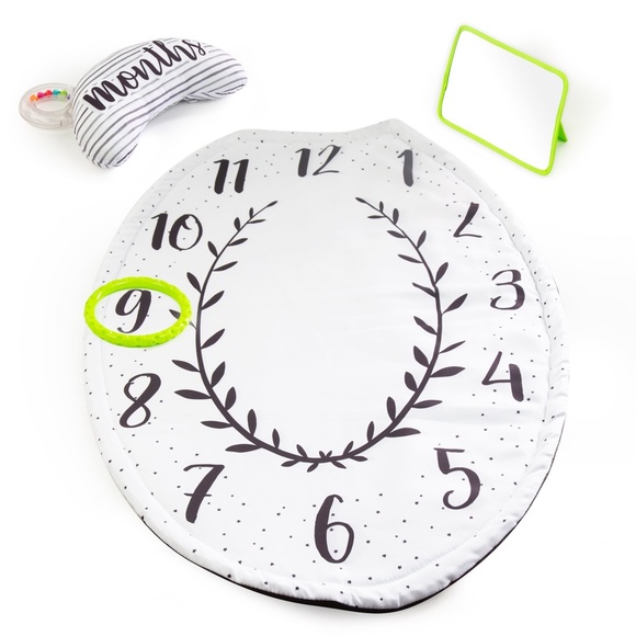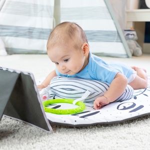 This Tummy Time Play Mat is perfect for tummy time which is encouraged to help a baby learn to strengthen the core, develop muscles, and practice head control. It features contrasting colors, a large discovery mirror, and a double-sided cushioned bolster to provide safe and steady support. It also includes one teether and one rattle which promote sensory stimulation. The large mirror has an easel back which allows tummy time to start with the mirror laying flat and gradually increasing the angle as the baby becomes more comfortable with tummy time. This mat is also helpful for tracking growth and milestones. The tummy time mat is for 0+ months featuring high contrast, simple patterns for newborns, and vivid colors for young babies.