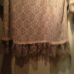 Tunic has leopard print flowers around neck and leopard trim around bottom of tunic. Looks great with brown leggings.