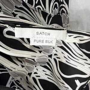 Satch sleeveless midi dress. The bottom is longer on one side. The back is a knotted racerback. There are loops for a belt but no belt is included. This is an Australian brand. Black background with white and red floral pattern. Two pockets. 100% silk. Dry clean only. Size 12.
