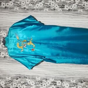 Luxurious satin robe in a vibrant blue. Features intricate dragon in gold and red embroidery. Perfect for lounging in style. M