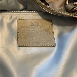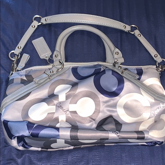 Practically new rare find satin “c” Coach purse. Navy blue grey and off white. Smoke free pet free home