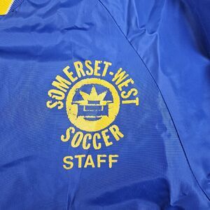 This vintage Pla-Jac by Dunbrooke bomber jacket is a stylish addition to any wardrobe. The jacket has a blue satin outer shell with a snap closure and a band collar. It features lightweight, quick-dry fabric that is both water-resistant and wind-resistant, making it perfect for fall and spring weather. There is a screen print of somerest-west Soccer staff on the front. Has some wear. Please inspect pics before purchasing.