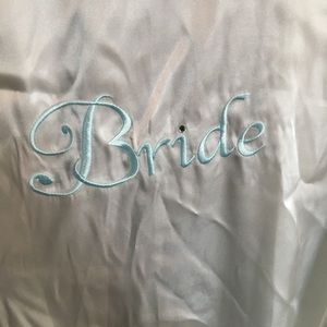 White satin robe with Bride written in blue thread on the back. Rhinestone over the ‘i’. Worn only for a picture.
