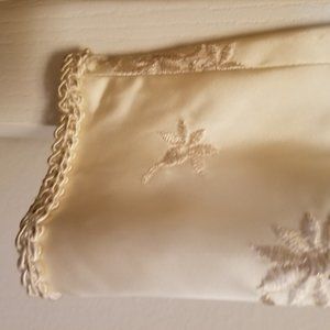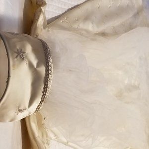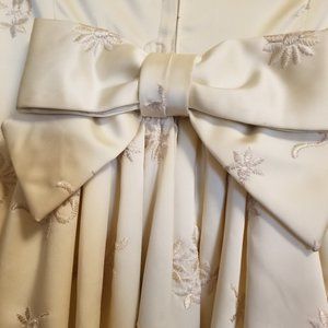 Candlelight satin wedding gown with beautiful applique pattern. Dress has bowed train and headpiece is included. This was purchased at Nordstroms some time ago, but is in terrific condition except for a few stains on the headpiece and a bit soiled on the inside edge of the train. The material and craftsmanship of this gown is of the highest quality. Perfect to wear dress as is for fall, winter and early spring wedding. Dress can also be altered in the neckline, sleeves or length.