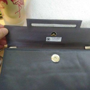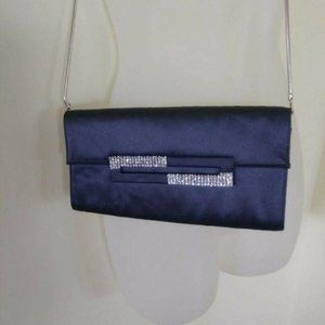 Bloomingdale’s Grey satin clutch with rhinestone detail. 9″ x 4″ Chain CAN BE TUCKED INSIDE TO convert the clutch to a Crossbody. Good pre owned condition. Matching Caparros heeled Sandals in another listing in my store