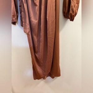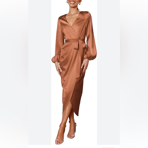SHEIN Satin Dress Deep V-Neck Wrap Long Sleeve Tie Waist Split Midi Dresses, Maxi Satin Dress Puff Sleeve Wrap V Neck Ruched Belted Long Formal Cocktail Dresses new without tag. bishop sleeve, tie waist, faux wrap, split hem, pleated details, hidden zipper back and draped regular bodice. V-neck, color- coral pink