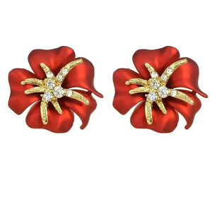 Satin Festive Red Enamel Tropical Flower Stud Earrings with Crystal Accents