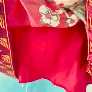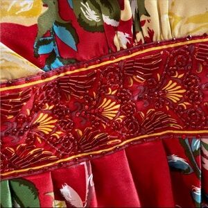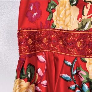 Vibrant red dress featuring a floral pattern with yellow accents. Perfect for a bold and stylish look. Backless & red beads through the empire waist. Fully lined. Fabric is poly but looks and feels silky. Lots of cleavage. Couldn’t return.