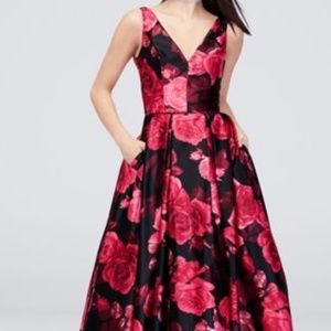 A ballgown dress with pockets and a floral pattern perfect for formal occasions. The dress is polyester with a back zipper, fully lined, and with a slight tail. The dress needs tender care and dry cleaning is best. The dress is made by Betsy and Adam. Only worn once.