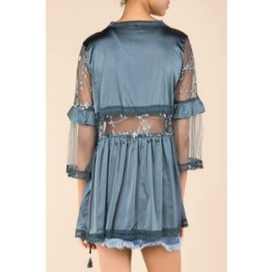 This is such a pretty kimono! Gorgeous peacock blue satin kimono with lace trim and sheer mesh embroidered sleeves and waist. Tassel self tie. This would be beautiful over a slip dress or paired with skinny pants or leggings. Add a little romance to your wardrobe!