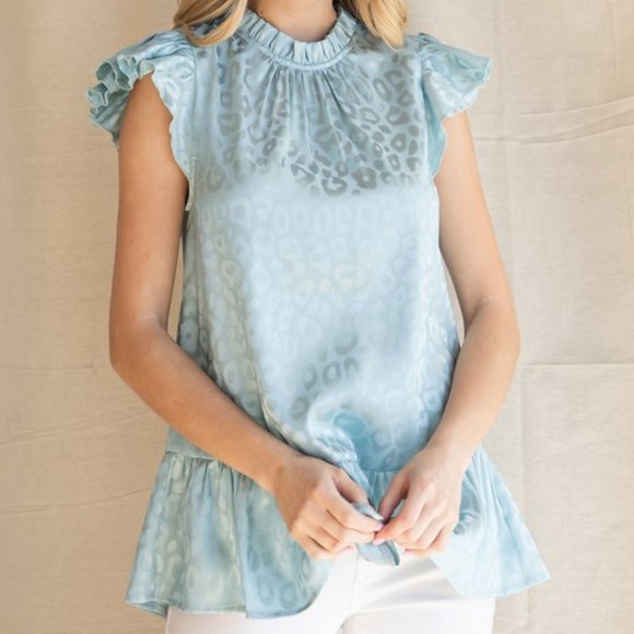 Beautiful Satin Leopard Print with a frill mocked neckline and ruffle cap sleeves! Unlined, un-sheer, lightweight!