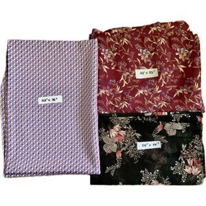 This is a lot of 9 pieces of mixed color satin polyester and sheer fabric with solid & floral patterns. The fabric is light in weight and has various finishes. It is suitable for interfacing, lining, crafts, and doll clothing. I think the fiber content is 100% polyester and the lot is ideal for sewing projects. Please note, due to computer/phone screen limitations, the color might not be the exactly as seen in person.