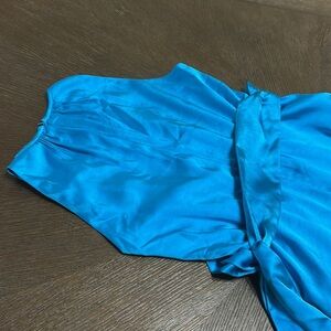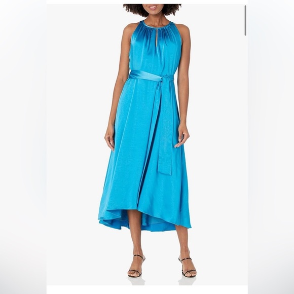 Keywords: satin dress, midi dress, halter neck dress, sleeveless dress, cocktail dress, party dress, evening dress, blue dress, asymmetrical hem, women's fashion, special occasion dress, dress with sash, keyhole dress