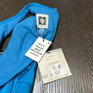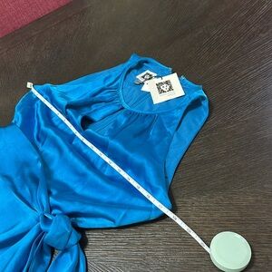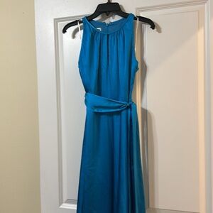 A vision of sophisticated charm, this vibrant blue midi dress captivates with its sleek, sleeveless design and elegant halter neckline. The flattering silhouette is accentuated by a removable sash that cinches at the waist, creating a defined and polished look. The eye is drawn to the subtle keyhole detail at the bust, adding a touch of allure to the overall refined aesthetic. The dress gracefully drapes into an asymmetrical hemline, offering a modern and chic twist. This dress would be perfect for a cocktail party, an evening wedding, or any special occasion where you want to make a stylish statement.
