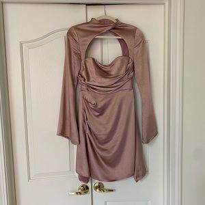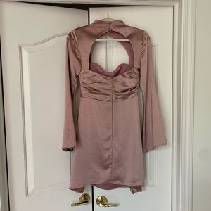 Mauve satin mini dress with wide sleeves, ruched front, choker neck style.