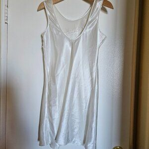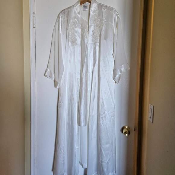 Beautiful white satin nightdress (knee-length) and matching robe (full-length for petite women); embroidered beaded border; robe has side pockets and a belt; small