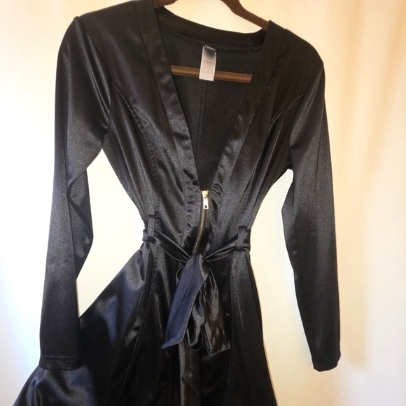 Black satin robe with a tie waist.