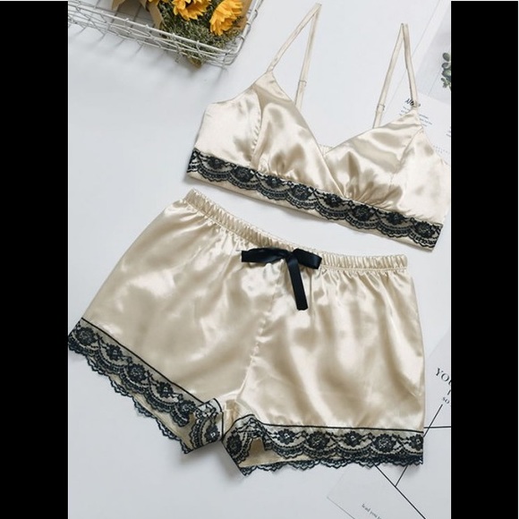 Adjustable strap satin bralette with lace detail and matching elastic waist pajama shorts