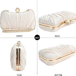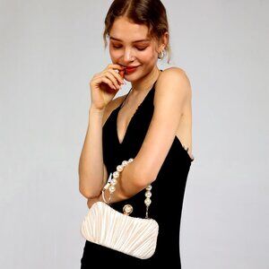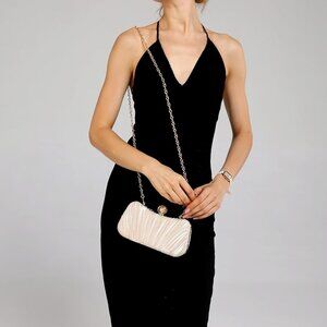 Features: Elegant satin shell design with pleated details and iridescent luster, accented with faux pearls and polished metal hardware for a luxurious vibe. Includes a detachable chain and a pearl chain so you can style it as a clutch, shoulder bag, or crossbody. Spacious enough for your phone, lipstick, keys, and small essentials – ideal for evening events.