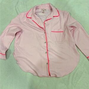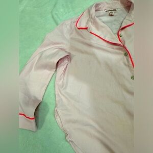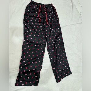 Satin Pink Hearts Victorias Secret Pijama Set. A gorgeous romantic and at the same time a very happy satin like pijama. It was used once. Top is a size Medium. Light pink with a strip of hot pink here and there. Buttons all the way down. Cute front pocket. Bottom is size X Small but fits up to a size medium. Super stretchy waist and red adjustable strap. Cute hearts all over on black pants with a red line side ways. Two side pockets. Both 100% Polyester.