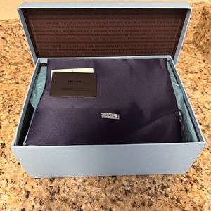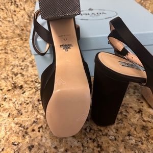 Brand new satin platform sandals featuring black, leather, silk blend, triangle logo, peep toe, branded insole, buckle-fastening ankle strap, 135mm block heel and 40mm platform.