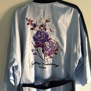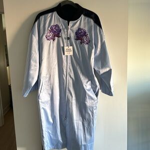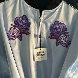 Gorgeous reversible satin navy blue/baby blue NWT Opening Ceremony coat with embroidered flowers on front and back. Embroidered logo on the flip side. Size Medium. So so pretty. Original retail $595!