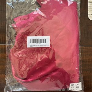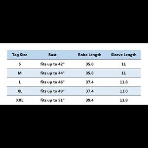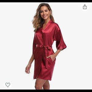 Wine colored satin robe. Great for getting ready, weddings, gifts, bachelorettes, maternity friendly. Has pockets, ties on both inside and outside of robe and stays closed. Bought a bunch for my bridesmaids and ordered an extra that was never used and can no longer return. Brand new, never worn, and in perfect condition. Comes in original packaging. I am 5’4, 36B and fits me with more than enough room! Size chart included