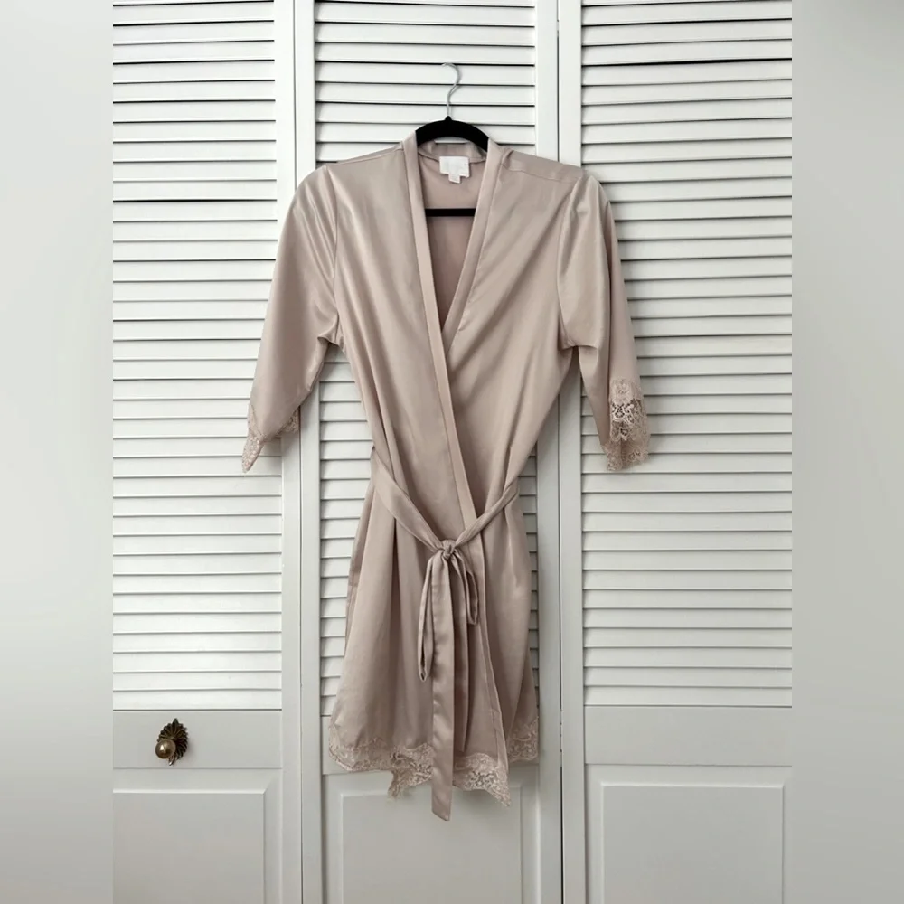Le Rose Robe. Worn a couple times, washed once. Some curling on the lace at the bottom of the robe. Can be fixed by ironing.