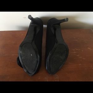 Black satin finished peep toes. Worn twice to professional formal events. Classic look with a pop of personality and fun.