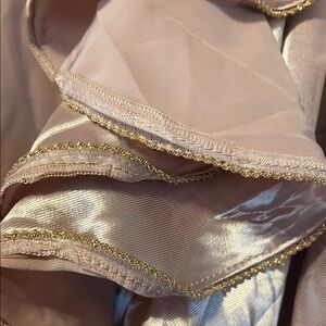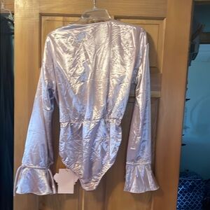 Elegant satin bodysuit with ruffle details. Features long sleeves and a deep V-neck.