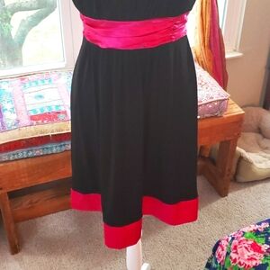 Black spaghetti strap, short dress with a hot pink sash and trim.