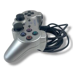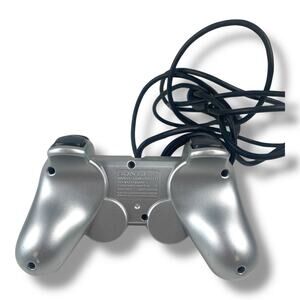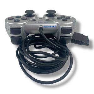 The product is a genuine Sony Dual Shock 2 controller in satin silver, designed for the Sony PlayStation 2 platform. It is wired and compatible with NTSC format consoles in North America. This official controller ensures a high-quality gaming experience with its reliable brand and model, making it a desirable choice for PlayStation 2 enthusiasts looking for a sleek and authentic gaming accessory.