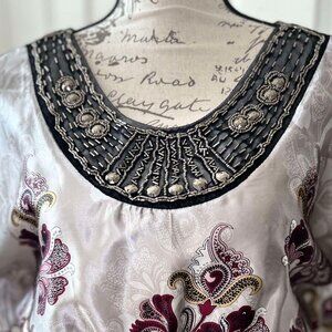 Satin Silver & Purple Paisley Batwing Sleeved Top with Beads & Gems for Accent
