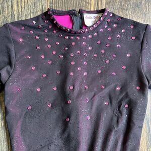 Beautiful Satin Stitches custom figure skating leotard and skirt set, girls/youth size 12. Heavyweight quality fabric with a black base, magenta undertones, and sparkling rhinestone embellishments. Long sleeve leotard with zip back and matching pull-on skirt. Excellent craftsmanship — made in USA.