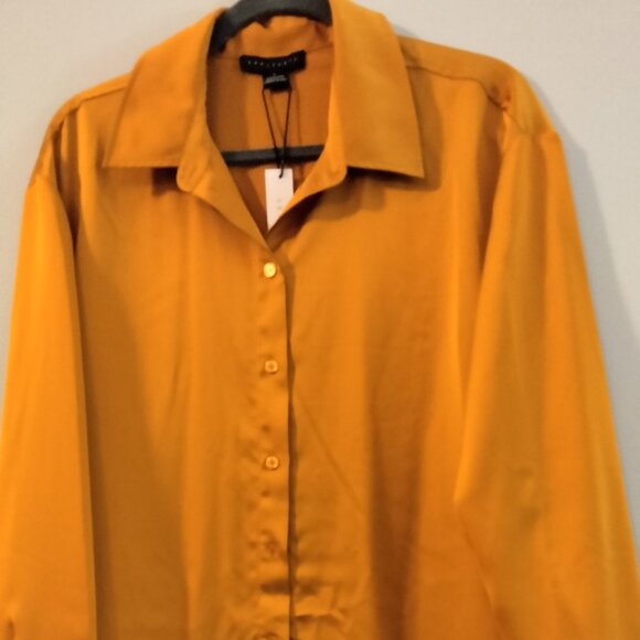 Golden apricot color satin blouse, size L. Polyester blend. Chest is 46 ", length is 30". Never worn, tags on. Extremely soft and flowy. Long sleeves. Button front.
