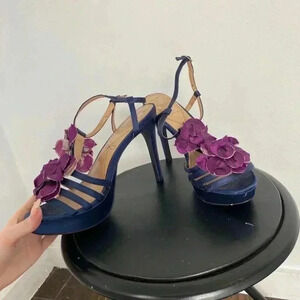 Satin blue & purple strappy heels. Has flower detailing. Light wear.