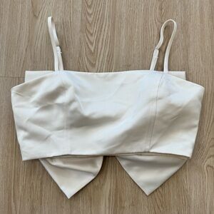 A satin cropped cami featuring a straight-cut neckline and back, adjustable cami straps, back statement bow embellishment, and concealed side zipper closure.
