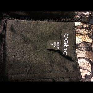Beautiful satin cocktail dress by Bebe only worn once. Form fitting but very flattering. The satin material is a lace pattern. Perfect with a satin blazer for dressy occasions or a leather jacket for going out!