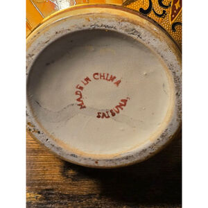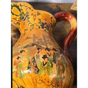 This is a pre-owned Satsuma-style pitcher, made in China. The pitcher features a bulbous body with a curved handle and a flared spout. It is decorated with intricate hand-painted scenes of figures and floral motifs in vibrant colors. The interior and base show crazing. The base is marked with "Satsuma" and "Made in China" in red ink. There are no visible chips or cracks.